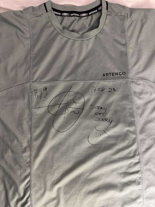 Monfils postete das signierte Trikot, das er im Match trug, und Djokovic schrieb eine witzige, unapologetische Botschaft auf sein Trikot, mit der er die Sache auf die Spitze trieb.