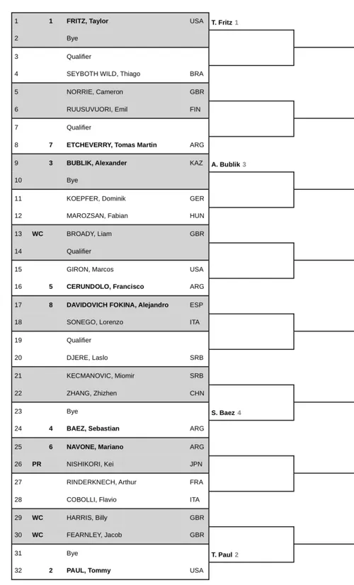 Tommy Paul ist an zweiter Stelle gesetzt und könnte in der zweiten Runde auf Billy Harris oder Jacob Fearnley, beides britische Wildcards, treffen. Paul wird jedoch möglicherweise nicht spielen, da er noch in Queen's ist. Alexander Bublik ist an dritter Stelle gesetzt und könnte es mit Dominik Koepfer oder Fabian Marozsan zu tun bekommen. Für Titelverteidiger Cerundolo geht es gegen Marcos Giron und dann wahrscheinlich gegen Liam Broady.