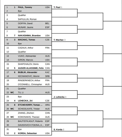 Er trifft zum Auftakt auf Tristan Schoolkate, bevor Zhizhen Zhang oder Thanasi Kokkinakis ins Spiel kommen. Jiri Lehecka steht im Finale von Brisbane und plant ein Double-Up. Er trifft auf Li Tu oder einen Qualifikanten, der ein Freilos hat, wie Paul, Korda und auch Tomas Machac.