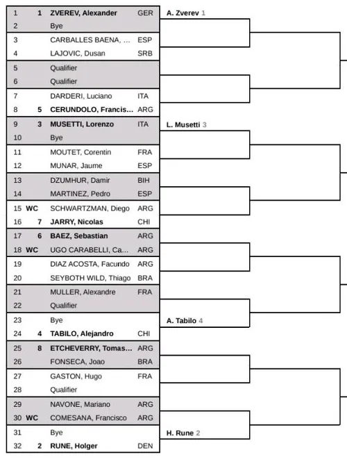 Der an Nummer drei gesetzte Lorenzo Musetti, der sich bei den südamerikanischen Sandplatzturnieren einen Namen gemacht hat, als er und Carlos Alcaraz auftraten, wird gegen Corentin Moutet oder Jaume Munar antreten.