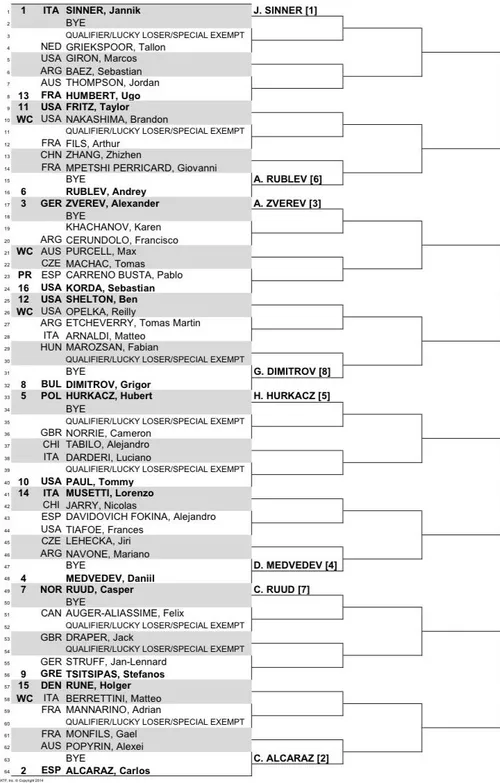 Überall in der Auslosung gibt es Spitzenspiele, darunter möglicherweise Stefanos Tsitsipas gegen Jack Draper. Casper Ruud tritt gegen Felix Auger-Aliassime an. Lorenzo Musetti wird gegen Nicolas Jarry antreten. Ben Shelton wird gegen Reilly Oeplka antreten.