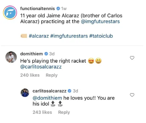 Der Youngster wurde auf Instagram gepostet, als er beim IMG Future Stars Showcase trainierte, und Thiem fiel auf, dass er das gleiche Schlägermodell wie er selbst benutzt. Sowohl Thiem als auch Alcaraz benutzen Babolat, aber sie verwenden unterschiedliche Modelle. Der jüngere Alcaraz benutzt nicht das Modell seines Bruders, aber Thiem kommentierte das mit den Worten: