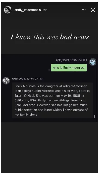Emily, das dritte Kind von McEnroe, fragte die Chatbots der Künstlichen Intelligenz (KI) nach ihrer Identität und erhielt eine wenig schmeichelhafte Antwort. Sie fragte: "Wer ist Emily McEnroe?" und bekam zu hören, dass sie nicht viel Aufmerksamkeit erregt und außerhalb ihres Familiennamens kaum etwas geleistet habe.