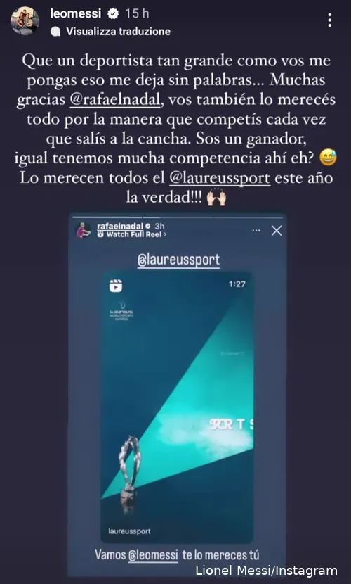 "Es ist mir eine Ehre, wieder für den Laureus Sportsman of the Year nominiert zu sein... aber... dieses Jahr... komm schon Lionel Messi, du hast es verdient", schrieb Nadal auf Instagram.