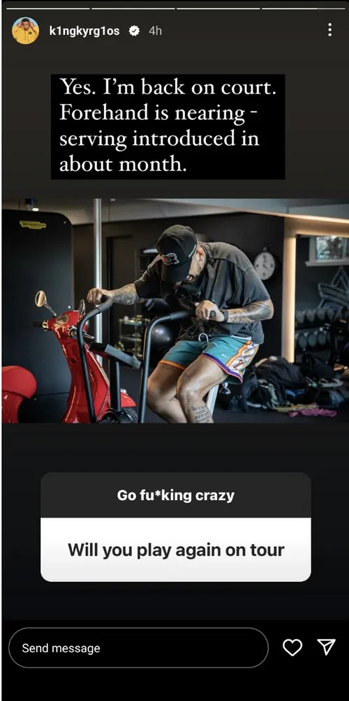 "Ja. Ich bin zurück auf dem Platz. Die Vorhand wird in einem Monat eingeführt", schrieb Kyrgios auf Instagram als Antwort auf die Frage eines Fans, ob er wieder auf der Tour spielen würde.