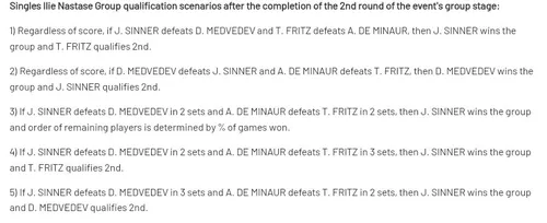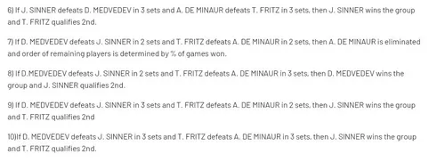 Medvedevs Chancen auf die Qualifikation hängen davon ab, ob er Sinner besiegt oder nicht, und auch de Minaur müsste Fritz schlagen. Umgekehrt müsste der Amerikaner seinen schnellen australischen Gegner besiegen und hoffen, dass Sinner entweder Medvedev besiegt oder der Russe Sinner in drei Sätzen besiegt.
