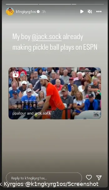 Diesmal war es der Amerikaner Jack Sock, der auf ESPN spielte, und Kyrgios teilte ein Video des ehemaligen Weltranglisten-Achten in seiner Instagram-Story und schrieb dazu: