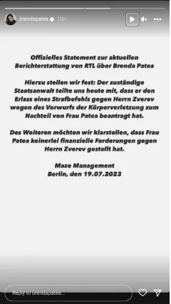 "Offizielle Stellungnahme zu der aktuellen RTL-Berichterstattung über Brenda Patea: Diesbezüglich teilen wir mit, dass uns der zuständige Staatsanwalt heute darüber informiert hat, dass er einen Strafbefehl gegen Herrn Zverev wegen des Vorwurfs der Körperverletzung zum Nachteil von Frau Patea beantragt hat. Wir möchten auch klarstellen, dass Frau Patea keine finanziellen Ansprüche gegen Herrn Zverev geltend gemacht hat", hieß es in Brenda Pateas Instagram-Story.
