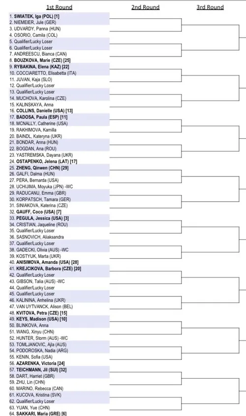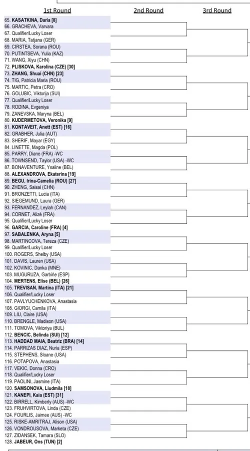 Weitere bemerkenswerte Erstrunden Partien sind Bianca Andreescu gegen Marie Bouzkova, Marta Kostyuk gegen Amanda Anisimova, Leylah Fernandez gegen Alize Cornet und Paula Badosa zunächst gegen Caty McNally.