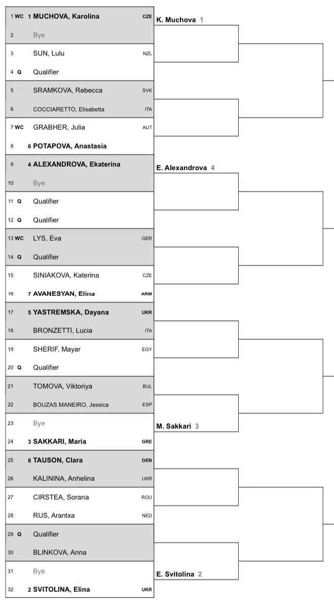 Maria Sakkari wird entweder auf Jessica Bouzas Maneiro treffen, die sie beim United Cup bezwungen hat, oder auf Viktoriya Tomova. Weitere hochkarätige Namen sind die ehemalige Weltmeisterin Anastasia Potapova sowie Ekaterina Alexandrova, Dayana Yastremska und Elina Avanesyan. Auch