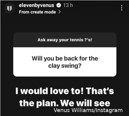 Williams gab ihr Comeback Anfang des Jahres in Australien, erlitt aber eine Verletzung, die sie seither außer Gefecht gesetzt hat. Sie hat in Australien sehr gut gespielt und hofft, dass sie bei ihrer Rückkehr auf den Sandplatz dasselbe erreichen kann. Williams antwortete auf Fragen in ihren sozialen Medien und machte Andeutungen über eine Rückkehr zum Sandplatztennis.