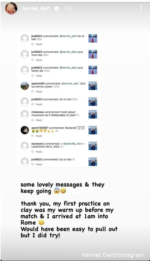 Tennisspieler werden in den sozialen Medien beschimpft, seit es die sozialen Medien gibt, und es ist ein Problem, über das viele gesprochen haben. Es ist nicht viel anders als bei anderen Sportlern, denn die meisten dieser Nachrichten kommen nach einer Niederlage, die meistens mit Glücksspielen zu tun hat. Dart verlor in der Qualifikation für die Rom Open und teilte einen Screenshot der Nachrichten, die sie seither erhalten hat: