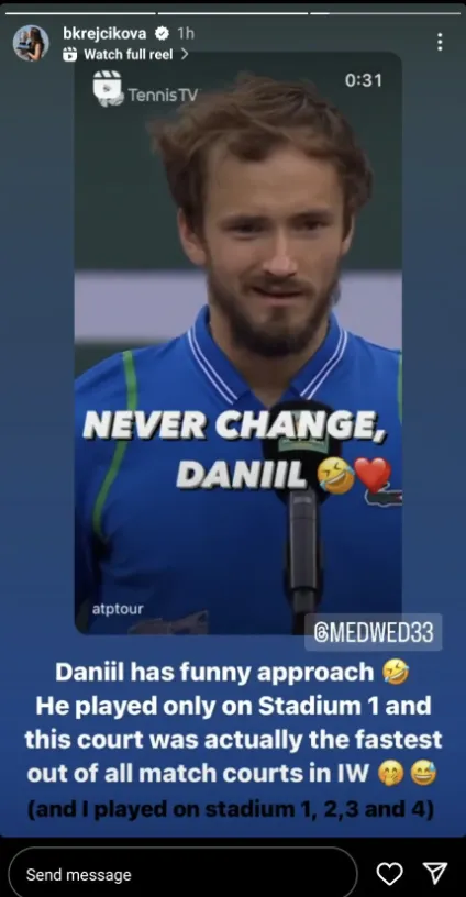 Krejcikova reagierte auf Medvedevs Kommentare in den sozialen Medien mit einem Scherz, indem sie darauf hinwies, dass er alle seine Matches im größten Stadion spielte, das der schnellste Platz von allen ist. In den kleineren Stadien wurde noch langsamer gespielt: