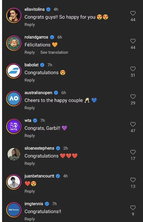 Sloane Stephens kommentierte ebenfalls mit "Herzlichen Glückwunsch". Zu den anderen Kommentatoren gehören ihre ehemalige Trainerin Conchita Martinez, Johanna Konta, Dominika Cibulkova und Carla Suarez Navarro.