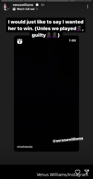"Ich möchte nur sagen, dass ich wollte, dass sie gewinnt (ohne dass wir gespielt haben, schuldig)", schrieb Venus auf ihren Instagram Stories.